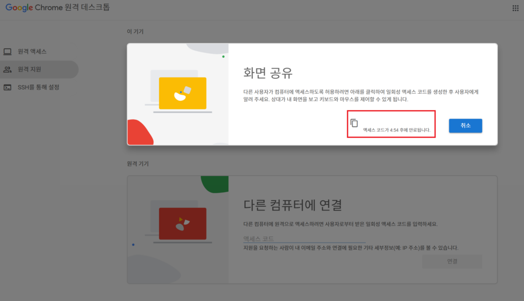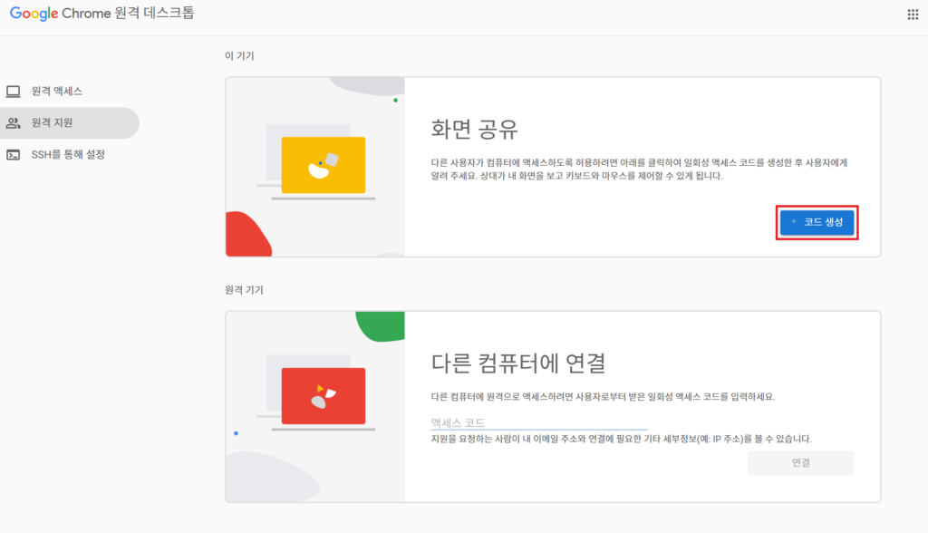 화면공유를 통한 원격 지원을 받기 위해선 코드 생성이 필요 합니다.