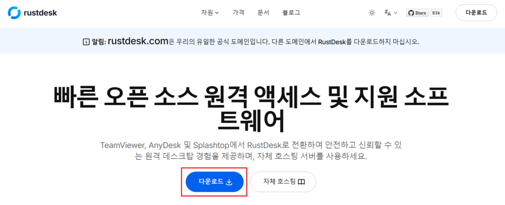 RustDesk : https://rustdesk.com/ko/ 에서 다운로드를 클릭 rustdesk 를 다운로드 합니다.
